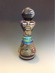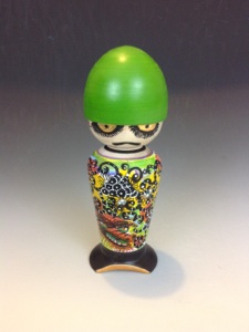 Nathan Imm and Risa Hirao work as a collaboration. Imm turns creations on the lathe from locally collected wood that highlights its nature, and Hirao is an illustrator whose drawings are influenced by Japanese science fiction and folk art. He creates the forms and shapes that provide the canvas for the imaginative hand-painted scenes and figures that she applies. Both are primarily self-taught, bringing lessons from a wide variety of arts and crafts methods and styles into their selected media. As a husband-and-wife team they collaborate in a way that each artist responds to and enriches the other’s work.